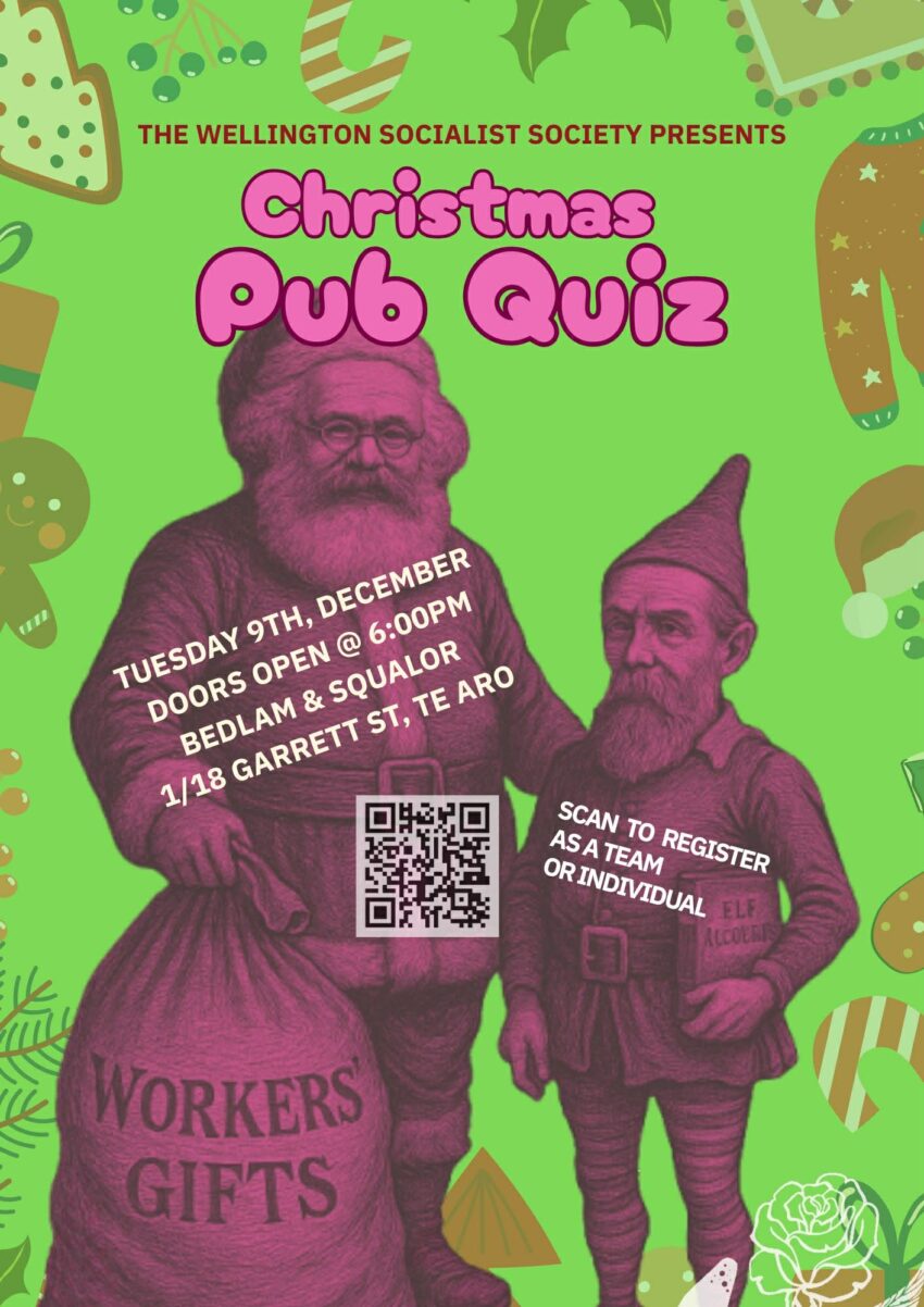 Welcome to our inaugural Christmas pub quiz hosted by the Wellington Socialist Society to cap off a long year! Have a few drinks and enjoy some pub trivia covering topics ranging everything from politics, pop culture, to general trivia. We’ll be awarding prizes to the teams that come out on top with a podium finish….
